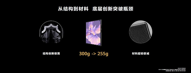 相較于部分友商采購(gòu)供應(yīng)鏈通用解決方案走捷徑的做法,華為研發(fā)團(tuán)隊(duì)選擇了難度更高的挑戰(zhàn),除了對(duì)鉸鏈和屏幕相關(guān)設(shè)計(jì)的前沿探索以外,還深入到結(jié)構(gòu)與材料科學(xué)等領(lǐng)域,從底層創(chuàng)新解決行業(yè)瓶頸。舉例來(lái)說(shuō),華為Mate Xs 2實(shí)現(xiàn)了極致的輕薄,擁有7.8英寸折疊大屏的前提下,整機(jī)僅重255g,大概相當(dāng)于一臺(tái)直板大屏手機(jī)戴上保護(hù)套的重量。