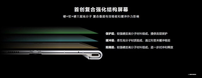 對(duì)于外折疊手機(jī)而言,屏幕的耐用性是消費(fèi)者頗為關(guān)注的,華為Mate Xs 2繼續(xù)用創(chuàng)新打消用戶(hù)的顧慮。其屏幕疊層“硬+軟+硬”的三層高分子復(fù)合疊層結(jié)構(gòu),可以更有效吸收并緩沖外力,繼而更好保護(hù)屏幕。首創(chuàng)的復(fù)合支撐鉸鏈結(jié)構(gòu),既有效提升鉸鏈強(qiáng)度,也有利于抗摔和抗沖擊能力的加強(qiáng)。相比前代產(chǎn)品,華為Mate Xs 2實(shí)現(xiàn)了抗跌落2.5倍、抗沖擊2.8倍、抗擠壓1.4倍的可靠性全面提升。