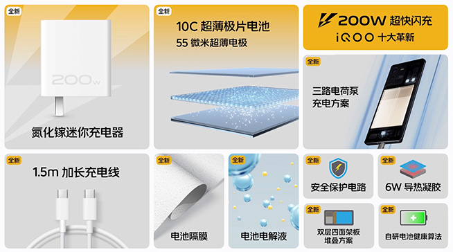 對(duì)于全新的200W超快閃充,iQOO稱(chēng)核心器件實(shí)現(xiàn)了100%國(guó)產(chǎn),這項(xiàng)技術(shù)于3年前啟動(dòng)研發(fā),專(zhuān)用的電池在1600次充放電過(guò)后,容量仍能有80%以上,標(biāo)配的200W充電適配器體積與120W適配器很接近。要提醒各位的是,僅iQOO 10 Pro配備200W快充和50W無(wú)線(xiàn)充電,iQOO 10則是120W優(yōu)線(xiàn)快充。