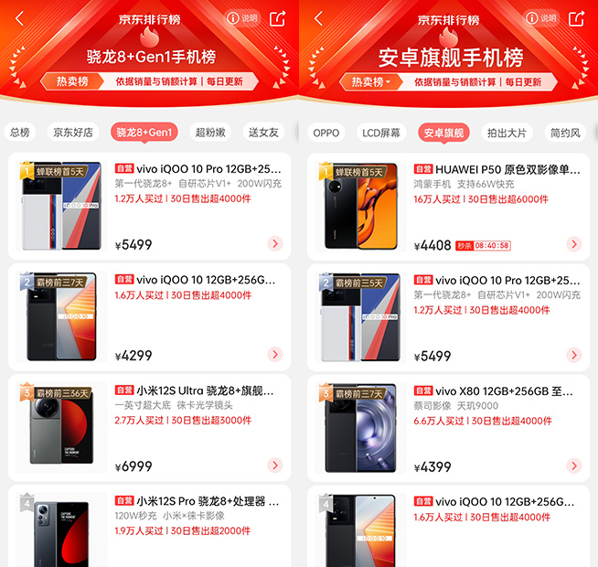 再以iQOO 10和iQOO 10 Pro為參考,兩款機(jī)型上市比小米12S系列晚了半個(gè)多月,如今分別有1.6萬人和1.2萬人買過,30日分別售出4469和4689件,且在近期的驍龍8+銷售排行榜上已超過小米12S系列,占據(jù)前兩位。不過上述數(shù)據(jù)存在疑惑的是,iQOO 10系列上市也就兩周多,30日售出的數(shù)據(jù)理應(yīng)等于總銷量(即XX人買過),而實(shí)際顯示的對(duì)應(yīng)數(shù)據(jù)又有較大的差距,對(duì)此我曾咨詢過京東相關(guān)人士,遺憾的是至今未得到確切的回應(yīng)。