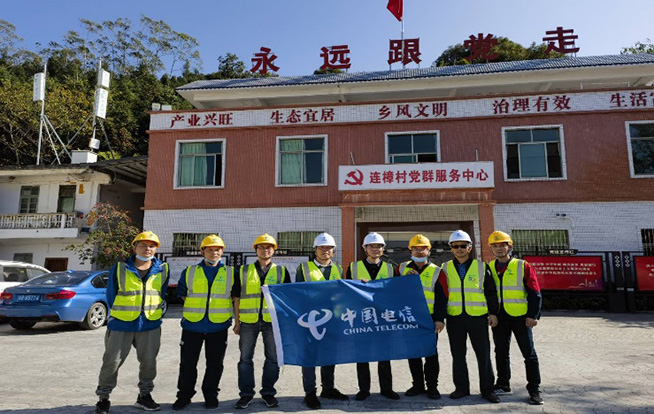 圖示:廣東電信網(wǎng)絡(luò)技術(shù)人員在清遠(yuǎn)市連樟村加快5G網(wǎng)絡(luò)建設(shè)