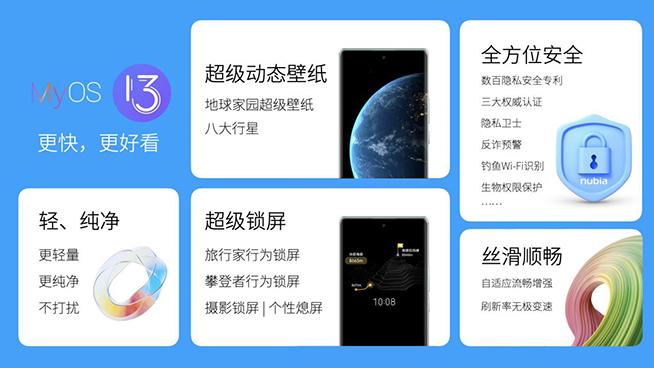 MyOS 13系統(tǒng)在“更快與更好看”上進(jìn)行深度創(chuàng)新優(yōu)化。為保持系統(tǒng)和諧個(gè)性之美,壁紙取色功能可根據(jù)壁紙色調(diào),自動(dòng)生成多套配色策略,整體界面色彩自動(dòng)隨之而變。系統(tǒng)內(nèi)設(shè)八大星球時(shí)空啟辰超級(jí)動(dòng)態(tài)壁紙,逼真的星球自轉(zhuǎn)和光影效果,帶來身臨其境般的宇宙星河暢游觀感。旅行家行為鎖屏,為可將每天的運(yùn)動(dòng)計(jì)步融合展現(xiàn)成點(diǎn)亮中國及環(huán)球地標(biāo)的虛擬運(yùn)動(dòng)路線。更值得一提的是,旨在為用戶提供輕量級(jí)的純凈系統(tǒng),少廣告、少預(yù)裝,MyOS13最大程度減少手機(jī)無用信息的干擾,打造干凈流暢的優(yōu)質(zhì)系統(tǒng)體驗(yàn)。