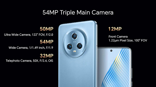 榮耀Magic5系列傳承了前兩代Magic系列數(shù)字旗艦“繆斯之眼”的特色設(shè)計(jì),后置三攝排列改為三角形排列,給人感覺(jué)會(huì)比之前簡(jiǎn)練。兩款機(jī)型的影像能力存在較明顯差異,榮耀Magic5配備5400萬(wàn)像素主攝,3200萬(wàn)像素長(zhǎng)焦鏡頭提供2.5倍光學(xué)變焦,背面50X的字眼表明其可以實(shí)現(xiàn)50倍數(shù)字變焦。而后置超廣角鏡頭以及前置居中自拍鏡頭依次為5000萬(wàn)像素和1200萬(wàn)像素。