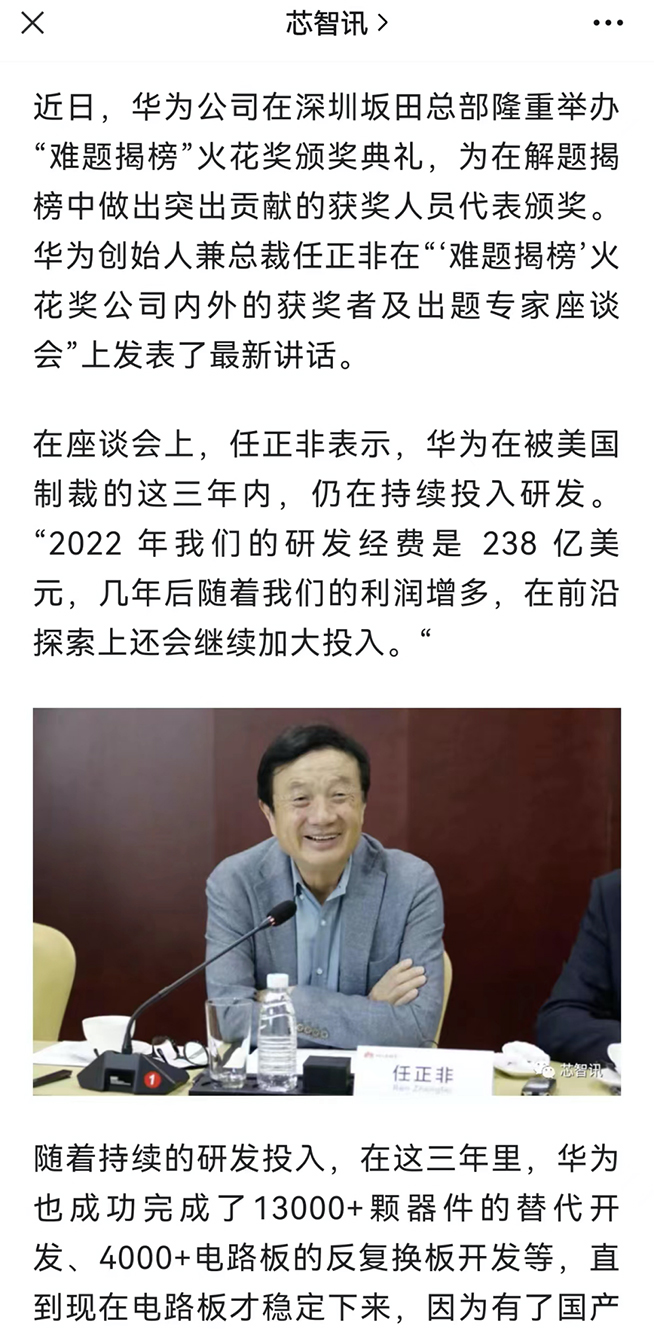 說到科研投入,其實每年各種權威榜單都顯示,華為公司科研投入的力度常年在全球科技公司中名列前茅,在中國企業(yè)中更是穩(wěn)居榜首并遙遙領先。前不久華為創(chuàng)始人兼總裁任正非在內部座談會上透露,華為在被美國制裁的三年多以來,依然堅持大力度投入研發(fā)和創(chuàng)新。三年來,華為完成了超過13000顆器件的替代開發(fā)、4000+電路板的反復換板開發(fā)。在過去的2022年,華為的研發(fā)經費達到238億美元。任正非強調,“華為在前沿探索上還會繼續(xù)加大投入”。