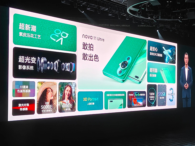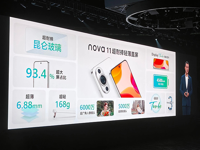 至于華為nova11,是用戶期待已久的OLED直屏機型,薄至6.88mm厚,僅有168g,屏占比達93.4%,也有昆侖玻璃版本可選。該機采用66W超級快充搭配4500mAh電池。