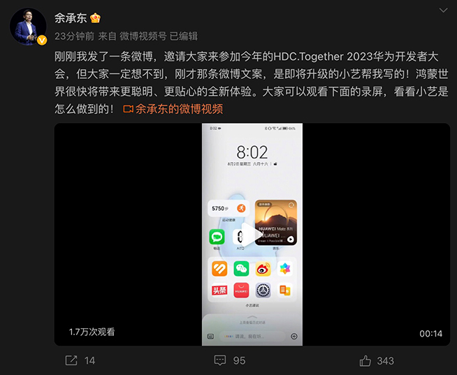 “即將升級的小藝”,“將帶來更聰明、更貼心的全新體驗”,余承東劇透的這些亮點,都會在HarmonyOS 4上得到實裝。此次分享的一段邀請函視頻還挺特別,其實是余承東直接用語音讓小藝幫忙寫的文案,作為日常生活和工作中很常見的實例,小藝生動詮釋了進化后的AI更聰明、更懂用戶、更具實用價值了。