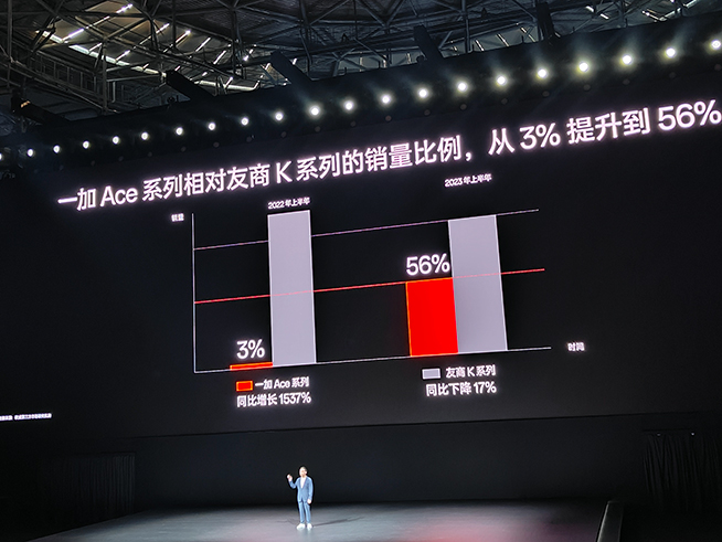 發(fā)布會的尾聲,李杰提到友商(Redmi),他給出的第三方權(quán)威數(shù)據(jù)顯示,今年上半年一加Ace系列的銷量已經(jīng)是友商K系列銷量的56%,去年這一數(shù)據(jù)僅為3%。他強(qiáng)調(diào)“產(chǎn)品力接近,一加定價一定更極致,價格接近,一加產(chǎn)品力一定更領(lǐng)先”。