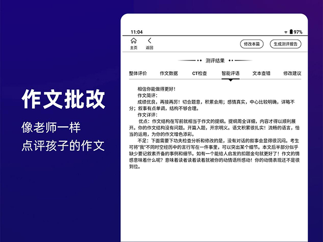 搭載了教育專業(yè)大模型的漢王AI電紙學(xué)習(xí)本內(nèi)置了AI批改引擎,可精準(zhǔn)識(shí)別批改作文的錯(cuò)誤和不足之處,所給的每1分有明確依據(jù),也不會(huì)多扣1分,給到的每一句評語也都有據(jù)可循。同時(shí)搭載了漢王自研的OCR識(shí)別技術(shù),手寫稿也能精準(zhǔn)研判,就連孩子學(xué)校里的考試作文都能夠快速評分,給到詳細(xì)的研判報(bào)告。作文評閱批改速度遠(yuǎn)超人工判卷,查錯(cuò)、評分、CT檢查、評語、建議,全流程3秒內(nèi)完成,比教師人工閱判快100倍。其中的CT檢查可從切合題意、內(nèi)容充實(shí)、結(jié)構(gòu)嚴(yán)謹(jǐn)、語言暢達(dá)、發(fā)展優(yōu)長5大維度進(jìn)行打分,相當(dāng)于給批改作文進(jìn)行了一次全面的掃描檢測,找出相關(guān)問題,精準(zhǔn)批改。