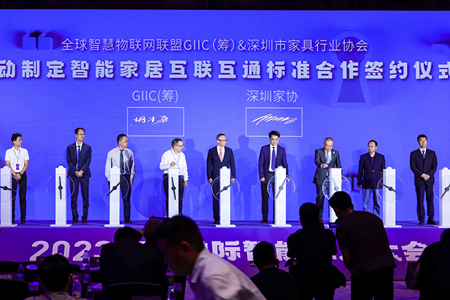 圖:全球智慧物聯(lián)網(wǎng)聯(lián)盟GIIC(籌)與深圳市家具行業(yè)協(xié)會(huì)?簽訂推動(dòng)制定智能家居互聯(lián)互通標(biāo)準(zhǔn)戰(zhàn)略合作協(xié)議