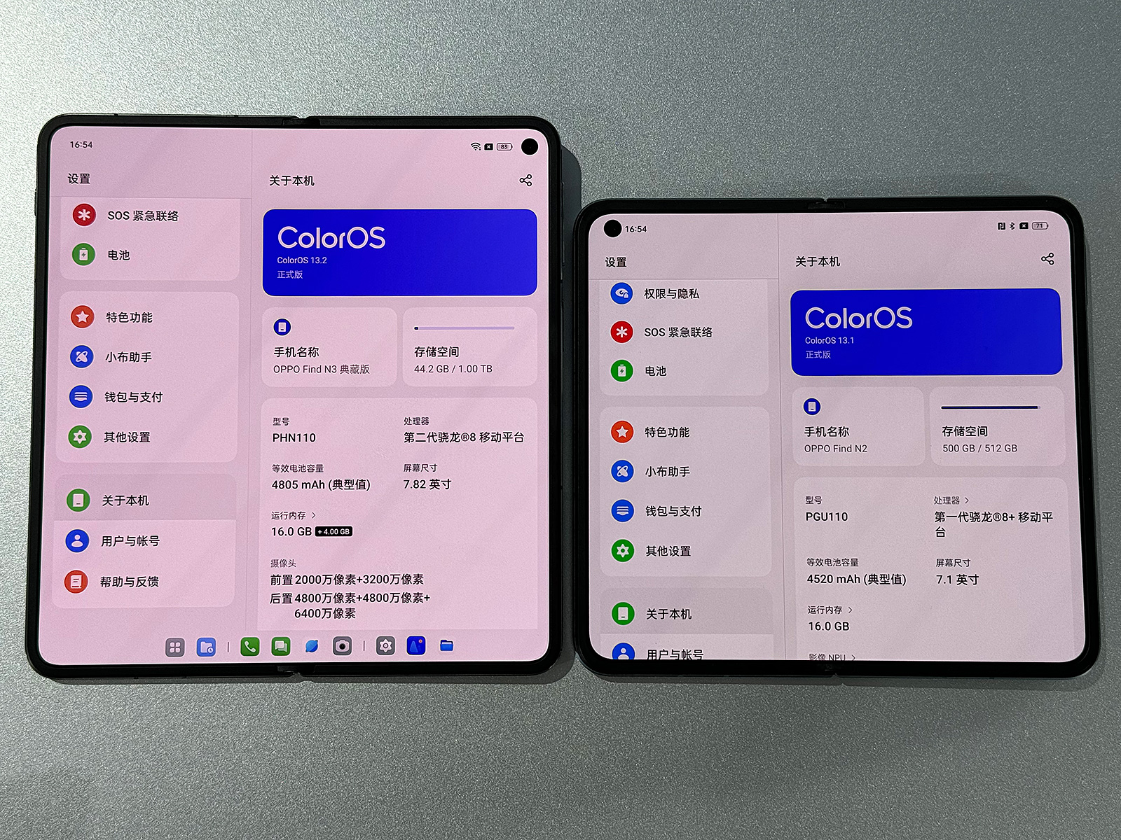 把OPPO Find N3與OPPO Find N2放在一起對(duì)比明顯可見,新機(jī)長(zhǎng)出一截,寬度相差無幾,機(jī)身厚度略薄一些,然而鏡頭比上代更大更凸了,機(jī)身重量在240g左右。外屏由之前的5.5英寸左右增大到6.31英寸,講真對(duì)于Find N系列的老用戶而言并不友好,原來可以較輕松的單手操作外屏,如今由于Find N3機(jī)身拉長(zhǎng)了,單手長(zhǎng)時(shí)間使用較為費(fèi)勁。不過話說回來,“遙控器”式的外屏已經(jīng)是當(dāng)下大折疊機(jī)型的標(biāo)配,OPPO選擇向主流妥協(xié),雖讓人惋惜但合情合理。