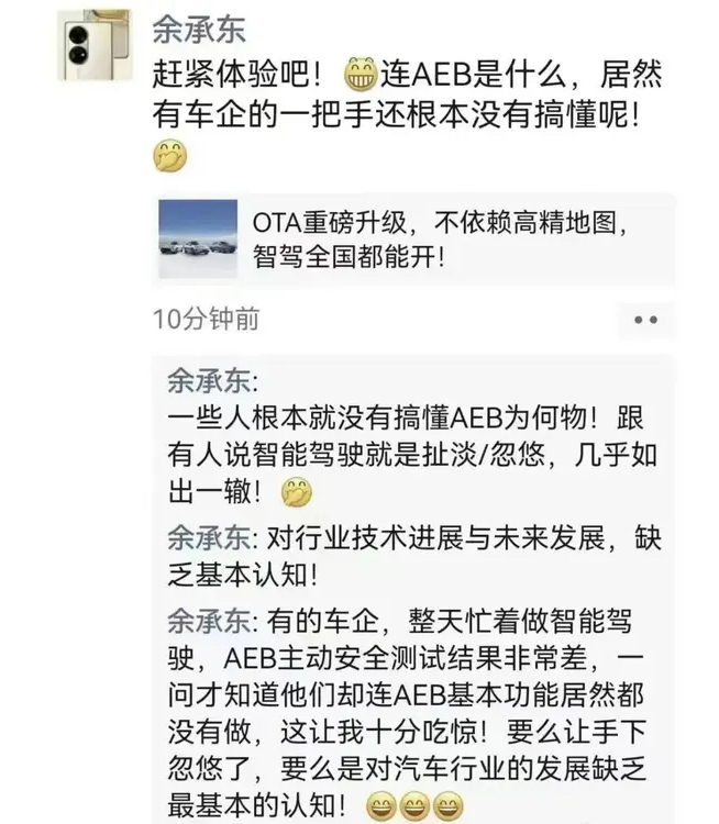華為余承東看到何小鵬的言論后發(fā)出多個笑臉表情,一連串硬核輸出回懟,直言友商“被手下忽悠了”、“對行業(yè)技術(shù)進(jìn)展與未來發(fā)展,缺乏基本認(rèn)知”。