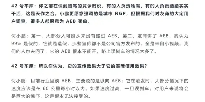 此次華為小鵬爭議源于何小鵬在接受42號車庫訪談時的主動挑事,當(dāng)時他稱“友商講了AEB,我認(rèn)為99%是假的,它就是造假”、“AEB 根本不能開”、“我的節(jié)操,雖然不是很高,但肯定比友商高?!?/p>