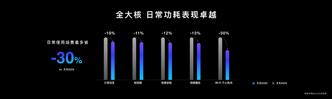 在更能代表用戶真實使用的日常場景下,如刷短視頻、瀏覽網(wǎng)頁、視頻錄制、開啟個人熱點等,天璣9300能比天璣9200省電10%-30%。