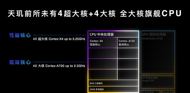 vivo X100系列搭載的天璣9300由臺積電先進(jìn)的N4P制程打造,集成了多達(dá)227億晶體管,打破行業(yè)常規(guī)的超大核+大核CPU設(shè)計,成為性能大漲的關(guān)鍵。八顆CPU核心中,四顆Cortex-X4性能核主頻至高3.25GHz,四顆Cortex-A720能效核主頻可達(dá)2.0GHz。