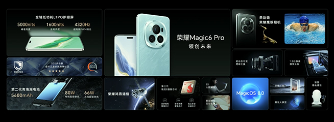 榮耀Magic6 Pro配備6.82英寸屏幕,支持3D人臉解鎖,電池容量增至5600mAh,有線快充和無線快充提升至80W和66W,但整機厚度也增至8.9mm,重量達到229g。榮耀Magic6 Pro共有五款顏色三款配置,12GB+256GB為5699元,16GB+512GB為6199元,16GB+1TB為6699元。