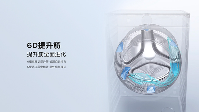不僅筒徑更大,TCL超級(jí)筒洗衣機(jī)還采用6D提升筋設(shè)計(jì)。提升筋位于內(nèi)筒壁,帶動(dòng)衣物翻轉(zhuǎn),在滾動(dòng)的過(guò)程增加摩擦,產(chǎn)生摔打效果。超級(jí)筒洗衣機(jī)將提升筋的數(shù)量從傳統(tǒng)的3根增加至6根,一長(zhǎng)一短的魚鰭狀提升筋交錯(cuò)排布,迎水面與背水面兩兩對(duì)應(yīng),配合棱狀條紋,不僅能摔打清洗,還能揉搓清洗。數(shù)據(jù)顯示,6D提升筋使衣物的翻轉(zhuǎn)次數(shù)增加1倍,運(yùn)動(dòng)軌跡延長(zhǎng)80%,洗衣效率和清潔效果雙雙提升。