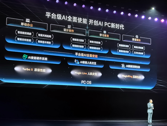 榮耀終端總裁趙明強調(diào),榮耀MagicBook Pro 16用AI重構筆記本電腦的用戶體驗,榮耀的AI PC可跨端八業(yè)務并發(fā)支持,比如多設備內(nèi)容自由流轉、PC調(diào)用手機攝像頭、應用接續(xù)等,而蘋果的跨端業(yè)務不能并發(fā)。