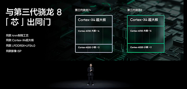 繼一加Ace 3V之后,真我GT Neo6 SE也采用了高通新推出的第三代驍龍7+移動(dòng)平臺(tái),這顆4nm SoC擁有與第三代驍龍8相同的架構(gòu),也配備了Cortex-X4超大核,當(dāng)然出于定位和功耗的考量,核心的主頻會(huì)比較“克制”。相比上代芯片,第三代驍龍7+的CPU和GPU性能分別提升15%與45%,其更大的進(jìn)步在于首次在驍龍7系產(chǎn)品中引入終端側(cè)AI能力。