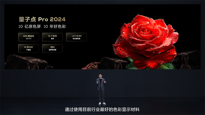 色彩方面,Q10K Pro依然沿用了TCL全球領先的量子點顯示技術,通過使用目前顯示行業(yè)最好的色彩材料——四元量子晶體Pro,從而實現(xiàn)了在DCI-P3標準下的 98%色域,可顯示10.7億級色彩,同時在這種極度豐富的色彩基礎上,全屏色純度提升95%,色準ΔE<0.99,色彩表現(xiàn)相當精準,壽命也提升到10萬小時不褪色。
