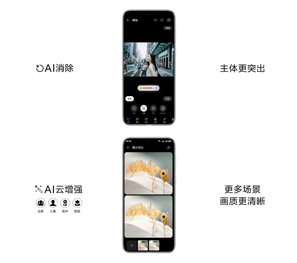 借助AI云增強功能,用戶還可以張張出大片。對于人像、合影、花卉以及微距拍攝,一鍵點擊后即可完成AI云增強,畫質(zhì)、色彩、整體表現(xiàn)力都會得到更優(yōu)質(zhì)的呈現(xiàn)。