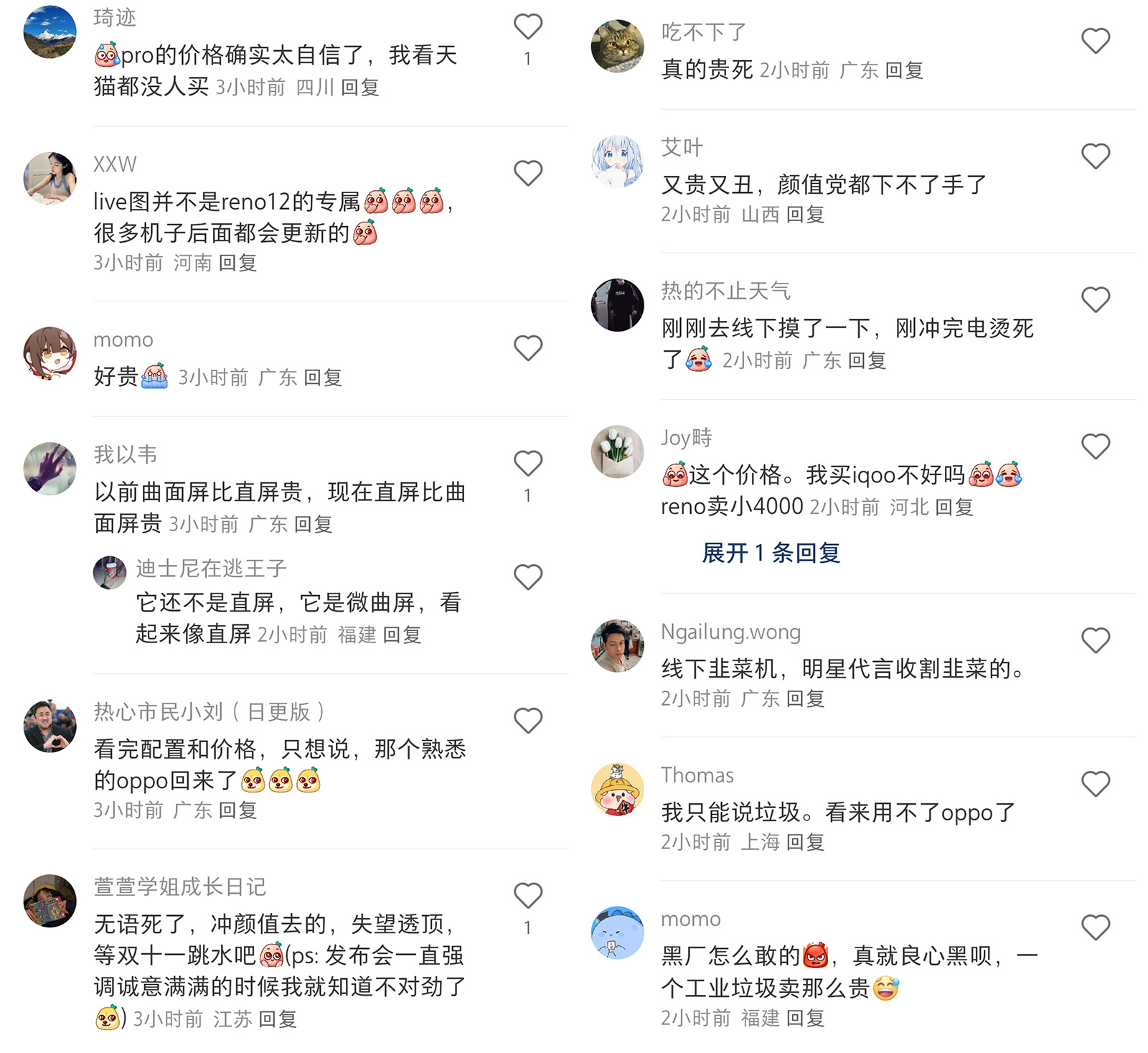 有網(wǎng)友一針見血指出“明星代言收割韭菜的”,耐人尋味的是,在明星代言這件事上Reno系列也經(jīng)歷了來回橫跳,周冬雨代言過幾代Reno機型之后,Reno系列一度不再依賴明星流量。但到了Reno11系列和Reno12系列由朱一龍代言,“黑廠”終究還是走回了“綠廠”的老路——明星營銷。