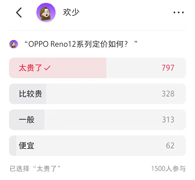 今年618大促已經(jīng)開啟,OPPO Reno12系列趕在5月下旬推出顯然也想搭車。然而綜合來看這次OPPO新品的誠意不足,網(wǎng)友也普遍認(rèn)為Reno12系列的定價高。根據(jù)本人在社交平臺發(fā)起的一項OPPO Reno12系列投票數(shù)據(jù),1500人的投票結(jié)果中,有超過50%的網(wǎng)友認(rèn)為“太貴了”,選擇“比較貴”的網(wǎng)友也超過了20%,二者相加達(dá)到75%。