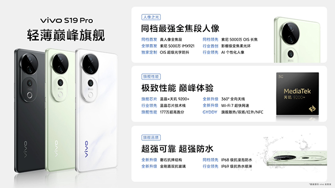 2024年5月30日,vivo正式發(fā)布vivo S19系列新品。vivo S19 Pro同檔首發(fā)全焦段人像,與索尼聯(lián)合研發(fā)IMX921傳感器搭配影棚級(jí)變焦柔光環(huán)以及全自研核心算法,帶來專為人像優(yōu)化的五大黃金焦段;延續(xù)S東方美學(xué)設(shè)計(jì),vivo S19系列還原東方美學(xué)獨(dú)有的神韻之美,推出煙雨青、桃花扇、千山翠、松煙墨、劍影灰五款配色。此外,vivo S19系列全系超薄藍(lán)海電池,引領(lǐng)智能手機(jī)告別一天一充,配合自研AI藍(lán)心大模型、百萬跑分旗艦芯、4500nits 120Hz護(hù)眼屏等功能,全面向旗艦看齊。