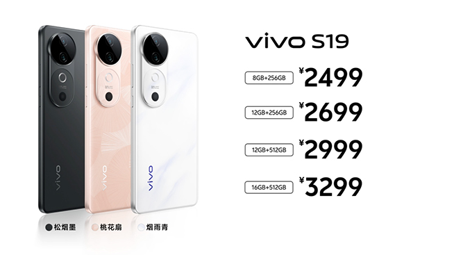 本次發(fā)布的vivo S19系列共有煙雨青、桃花扇、千山翠、松煙墨、劍影灰五款全新配色。其中,vivo S19 8GB+256GB版售價(jià)2499元,12GB+256GB版售價(jià)2699元,12GB+512GB版售價(jià)2999元,16GB+512GB版售價(jià)3299元;vivo S19 Pro 8GB+256GB售價(jià)3299元,12GB+256GB版售價(jià)3499元,12GB+512GB版售價(jià)3799元,16GB+512GB版售價(jià)3999元。
