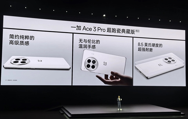 輪到C位的一加Ace3 Pro手機(jī)登場(chǎng),其罕見的提供三款不同質(zhì)感后蓋,對(duì)應(yīng)不同銀、綠、白三款配色,那個(gè)對(duì)外觀和質(zhì)感不將就的一加又回來了。其中銀色和綠色分別為玻璃與素皮工藝打造,而白色的超跑瓷典藏版為3D一體陶瓷后蓋,為此還專門開設(shè)了新產(chǎn)線,李杰豪言其質(zhì)感超越萬元旗艦機(jī)。