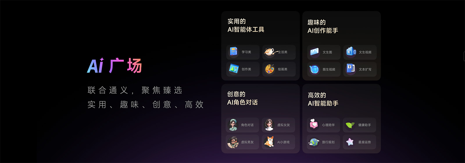 在AI應(yīng)用方面,AI廣場覆蓋娛樂、辦公、健康、學(xué)習(xí)、專業(yè)問答、健身、角色對話等場景,它可以是練口語/繪畫的學(xué)習(xí)好搭子,總結(jié)課程筆記的效率小幫手,生成圖片與視頻的創(chuàng)作神助攻,噓寒問暖的虛擬男/女友,甚至是只存在于書籍里的文學(xué)大咖或虛構(gòu)人物。
