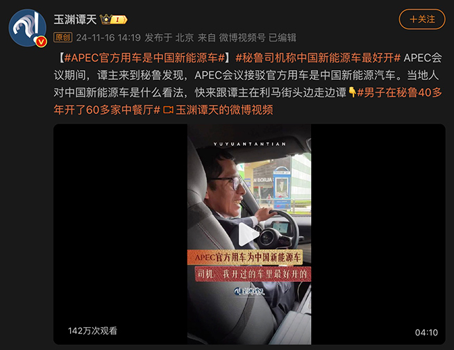 今年APEC會議領(lǐng)導(dǎo)人峰會于南美國家秘魯?shù)氖锥祭R舉行,博主“玉淵譚天”當(dāng)?shù)貐⒄蛊陂g發(fā)現(xiàn),利馬當(dāng)?shù)赜胁簧佟笆烀婵住保热鐭艋\、叉燒酥、大白兔糖等,并且今年APEC會議秘魯領(lǐng)導(dǎo)人峰會官方指定接駁用車也是中國新能源汽車。不斷譜寫新能源車輝煌的比亞迪再次亮相國際舞臺。