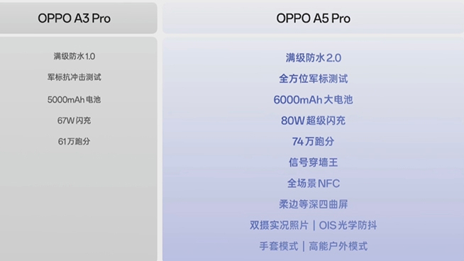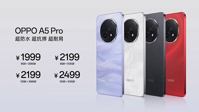 12月24日,OPPO正式推出A系列新品OPPO A5 Pro。作為A系列定位更高的機型,相比半年多前推出的A3 Pro,其整體的防護特性全面提升,處理器則小幅升級為天璣7300,增加全場景NFC,電池漲至6000mAh,定價1999元起。