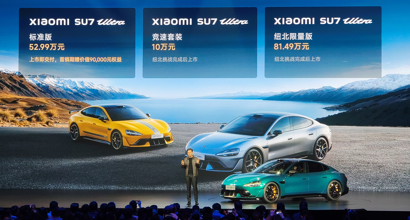 發(fā)布會壓軸的環(huán)節(jié)自然是由雷軍親自介紹小米SU7 Ultra,其最終定價為52.99萬元起,2萬元定金先到先得,3月底下定送9萬元權(quán)益。相比幾個月前81.49萬元的預(yù)售價,小米SU7 Ultra量產(chǎn)車直接便宜了近30萬元,對于潛在客戶群而已顯然是超大的驚喜。根據(jù)小米官方海報,小米SU7 Ultra開售僅10分鐘就收到了突破6900臺大定,2小時大定數(shù)已超1萬臺,這對于一款售價50萬元的新車而言,成績喜人。