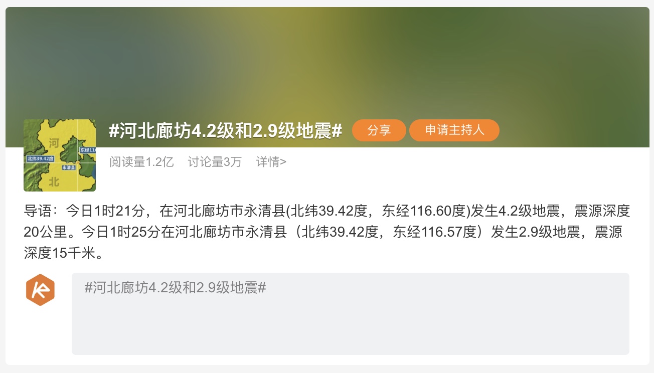 今天被地震消息刷屏了!3月26日凌晨河北廊坊永清縣接連發(fā)生兩次地震,京津冀多地有明顯震感。目前,微博話題#河北廊坊4.2級和2.9級地震#的閱讀量達1.2億,討論量3萬,一度登頂熱搜榜首。與此同時,“地震等級和危害”、“地震時如何避險”、“你的手機設置地震預警了嗎”等話題,持續(xù)引發(fā)網(wǎng)友們的大量談論。