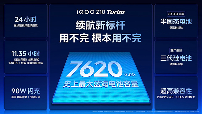 由于這代機型新增Pro機型,iQOO Z10 Turbo的定位略有下調(diào),其采用天璣8400滿血版,安兔兔超過190萬。值得一提的是,iQOO Z10 Turbo電池容量增至7620mAh,為單電芯設(shè)計,搭配90W閃充,王者榮耀120Hz+極致畫質(zhì)的場景下,續(xù)航長達11.35小時。