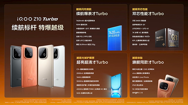 iQOO Z10 Turbo的屏幕、主攝、散熱、Q1電競芯片、雙揚聲器等多項特性均與iQOO Z10 Turbo Pro一致,有四款顏色四種容量配置,起售價1799元。