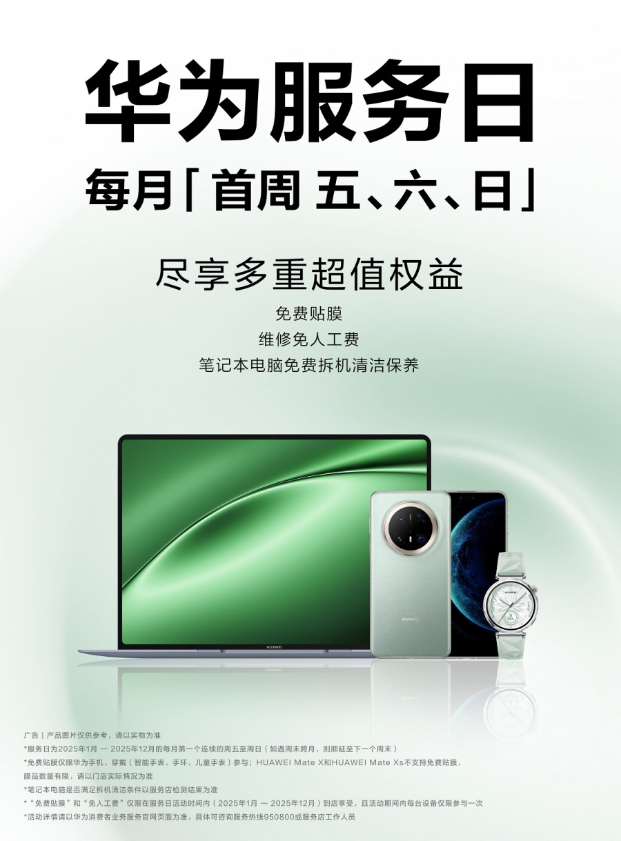 首先在設(shè)備養(yǎng)護(hù)方面,2025年華為服務(wù)日新增筆記本電腦免費(fèi)拆機(jī)清潔保養(yǎng)(含外觀)的權(quán)益。