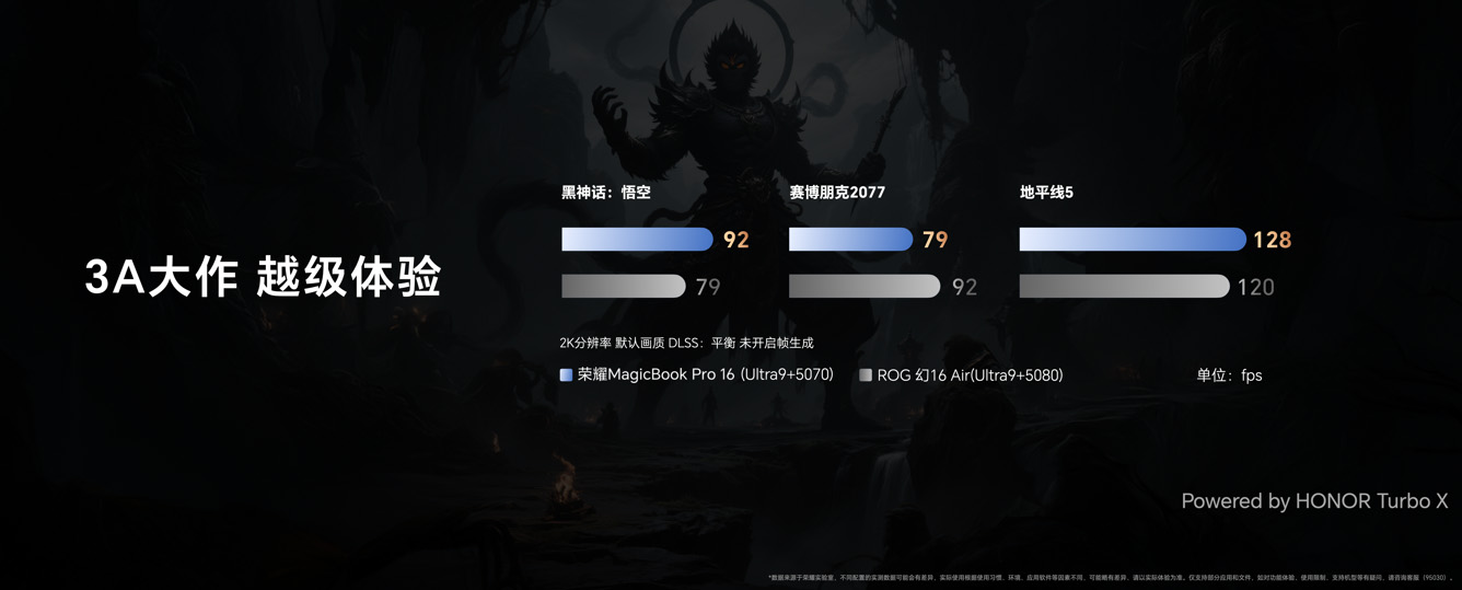 榮耀MagicBook Pro 16 HUNTER版2025擁有智能、高能、狂戰(zhàn)三檔性能模式可選,在狂戰(zhàn)模式下,整機(jī)最高可釋放150W超強(qiáng)性能。在HONOR Turbo X調(diào)校技術(shù)加持下,這款筆記本在不少主流3A和網(wǎng)游中實測的游戲幀率都達(dá)到行業(yè)領(lǐng)先水平,為用戶帶來更強(qiáng)大和流暢的越級體驗。