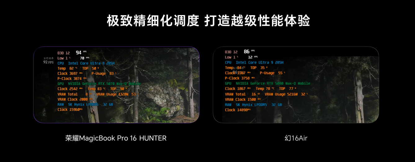 榮耀MagicBook Pro 16 HUNTER版2025首發(fā)搭載滿血版NVIDIA? GeForce RTX?5070顯卡,它采用全新的Blackwell架構(gòu),擁有4608 CUDA流處理器,8GB 128bit GDDR7顯存,支持光線追蹤和DLSS 4.0。顯卡擁有115W 滿血性能,可輕松應(yīng)對3A大作和高負(fù)載生產(chǎn)力場景。