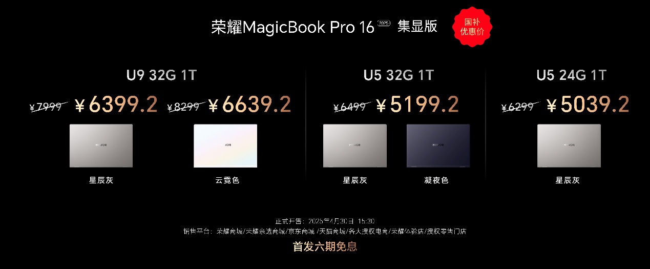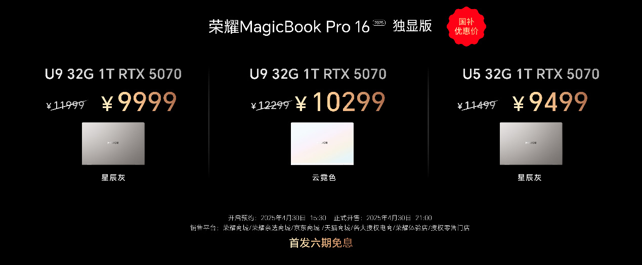 榮耀MagicBook Pro 16 2025提供獨顯和集顯兩種配置,滿足用戶的不同預(yù)算需求。其中,搭載RTX 5070獨立顯卡的榮耀MagicBook Pro 16 HUNTER版2025國補(bǔ)到手價9499元起,4月30日21:00全渠道首銷;集顯版國補(bǔ)到手價5039.2元起,4月30日15:30全渠道首銷,想搶先體驗的用戶可以抓緊時間入手。