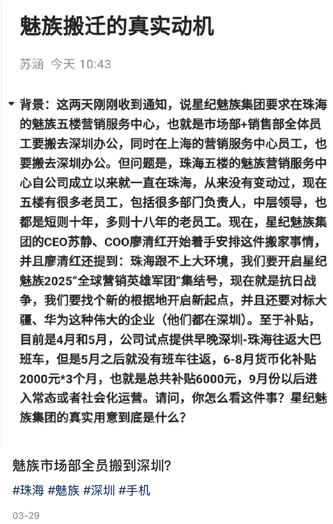 說起武漢,順便插播星紀魅族的一則動態(tài),前不久網(wǎng)絡上曝光一份內(nèi)部文檔聲稱,今年4月開始星紀魅族位于珠海的營銷服務中心全員搬遷至深圳。由于對員工的搬遷補償不給力(總計補貼6000元/人),預計會流失不少老員工,將加速星紀魅族的“星紀化”。