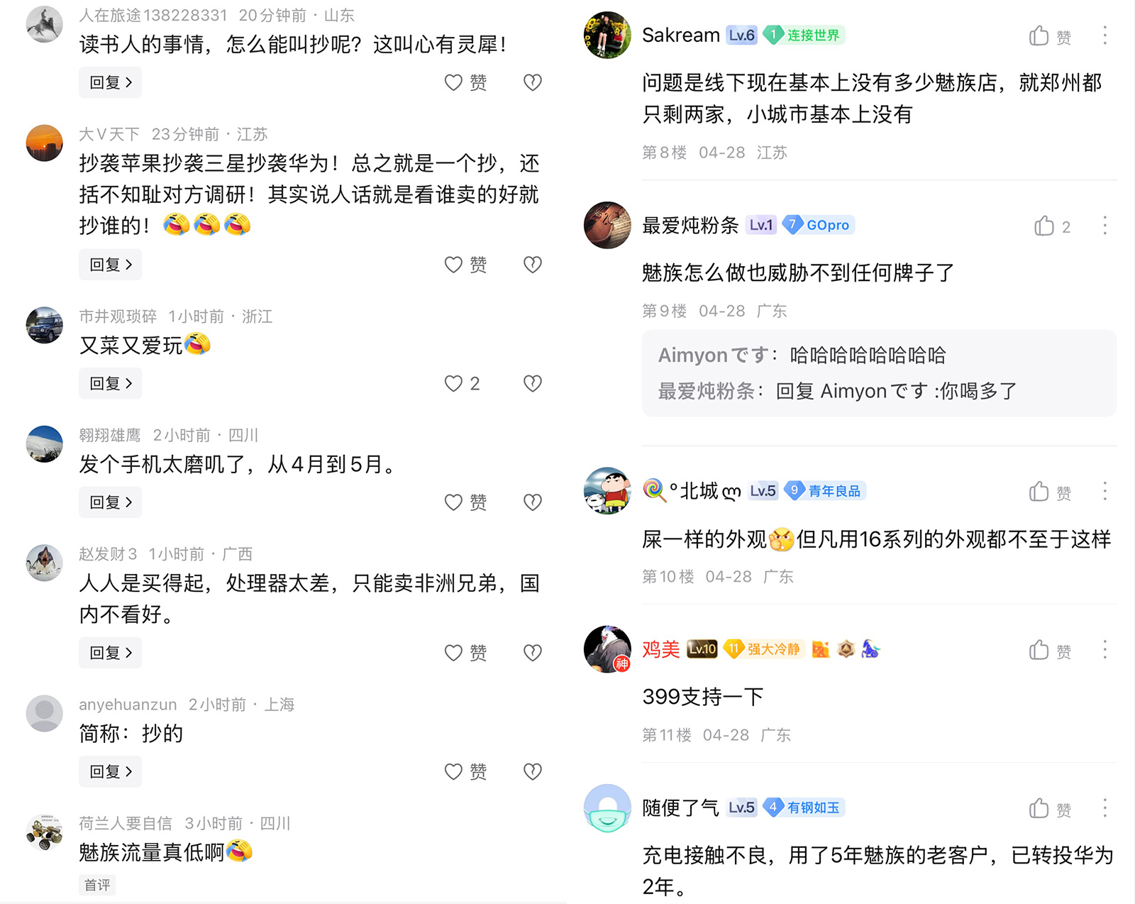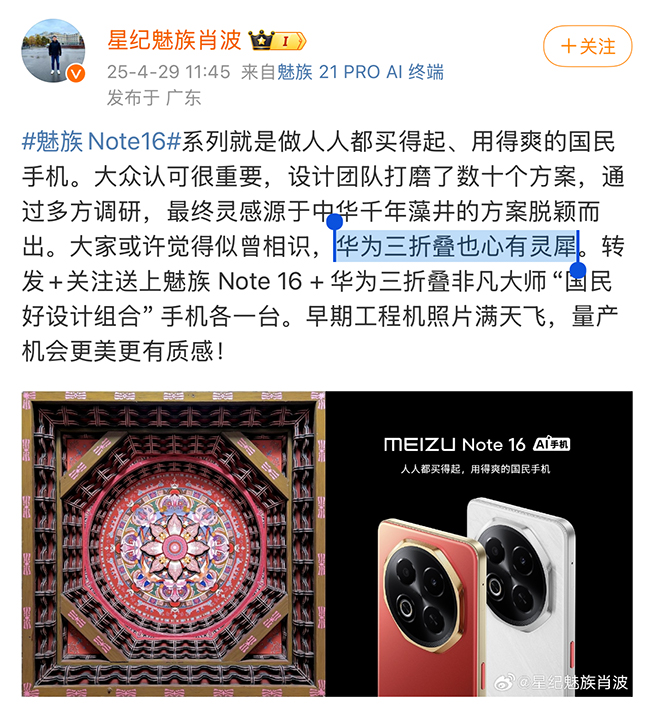 接下來再聊聊魅族,星紀魅族Note 16系列不僅傳承了之前魅族“超長預熱”刷存在感的套路,還玩起了跳票和碰瓷,引發(fā)許多網(wǎng)友反感。魅族Note 16系列號稱與華為三折疊“心有靈犀”,并且是“人人都買得起、用得爽的國民手機”、“平凡大師”。有網(wǎng)友評價魅族幼年抄蘋果,青年抄三星,成年抄華為,硬是把自己抄沒了!從國產(chǎn)蘋果到珠海小三星,星紀魅族這是要押寶武漢小華為了嗎?