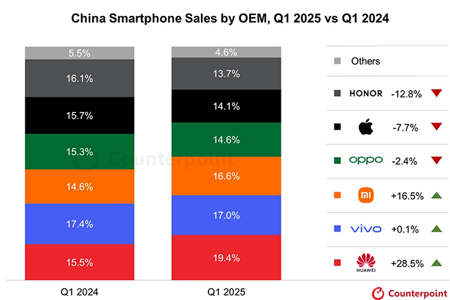 目前來看,各方對于OPPO頻繁掛鉤OPhone的評價褒貶不一,“OPhone”到底是良藥還是毒藥,尚需更長時間驗證。需要指出的是,一旦消費者加深了OPPO即OPhone的認知,品牌的調(diào)性、成長性恐怕都會面臨不少限制。而由市場份額變化來看,OPPO的這招險棋暫未明顯改善其困境。根據(jù)Counterpoint數(shù)據(jù)的對比,2024年OPPO智能手機銷售份額在中國市場相比2023年大跌10.4%,排名掉出TOP5;2025年Q1,同比下滑2.4%,排名第四,與第六的榮耀份額相差不到1%。隨著近幾個季度華為和小米的穩(wěn)健成長,加上國內(nèi)市場vivo長期堅挺(近四年國內(nèi)市場“四連冠”),OPPO躋身市場前三變得越發(fā)困難,稍有不慎還會跌出前五。
