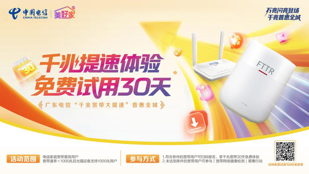 廣東電信家庭寬帶星級客戶,即日起線上報名,可免費體驗千兆寬帶1個月。