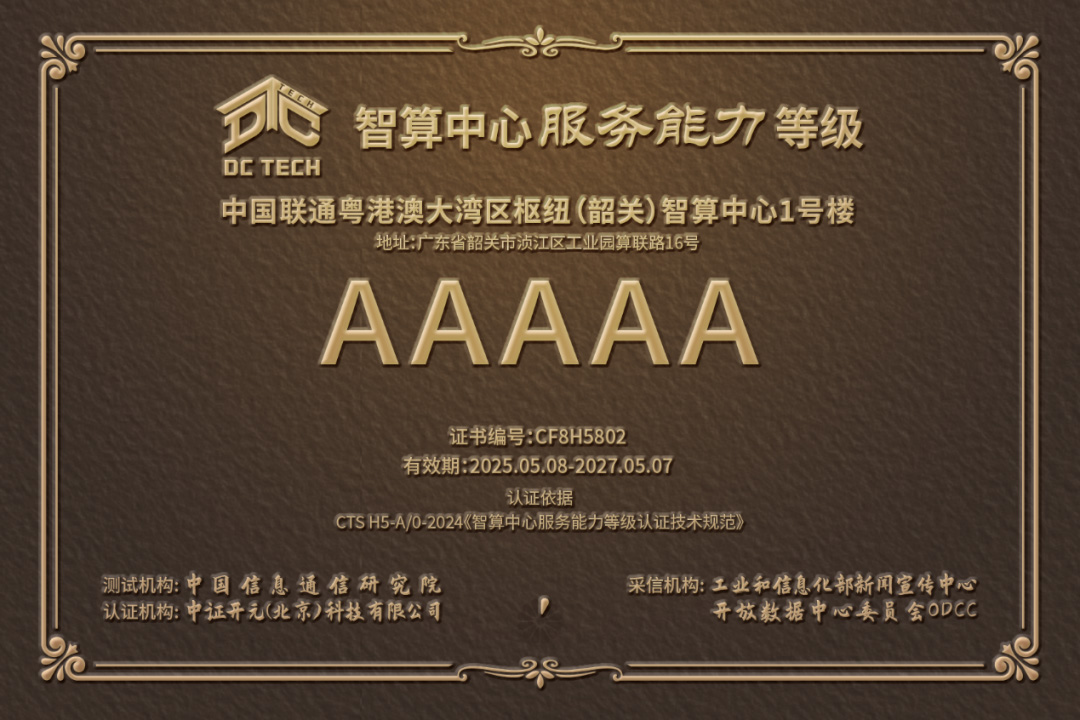 服務(wù)能力是智算中心對(duì)外提供價(jià)值的關(guān)鍵。業(yè)務(wù)范疇上,具備卓越服務(wù)能力的智算中心能夠迅速響應(yīng)市場(chǎng)變化,靈活調(diào)整資源配置,為用戶提供定制化、高性能、低延遲的計(jì)算服務(wù)。智算中心服務(wù)能力等級(jí)從資源類(lèi)服務(wù)、數(shù)據(jù)類(lèi)服務(wù)、模型類(lèi)服務(wù)、安全保障、企業(yè)資質(zhì)共五個(gè)維度的相關(guān)要求對(duì)被測(cè)對(duì)象展開(kāi)認(rèn)證,根據(jù)最終得分情況劃分為A到AAAAA級(jí)別。該認(rèn)證經(jīng)中國(guó)信息通信研究院專(zhuān)業(yè)測(cè)試,并由工信部新聞宣傳中心及開(kāi)放數(shù)據(jù)委員會(huì)ODCC聯(lián)合作為采信機(jī)構(gòu),全國(guó)共8家智算中心通過(guò)測(cè)試并獲不同等級(jí)認(rèn)證,通過(guò)智算服務(wù)能力最高等級(jí)5A級(jí)認(rèn)證僅有2家,中國(guó)聯(lián)通粵港澳大灣區(qū)樞紐(韶關(guān))數(shù)據(jù)中心作為其中之一,也是大灣區(qū)首家獲此認(rèn)證的智算中心。