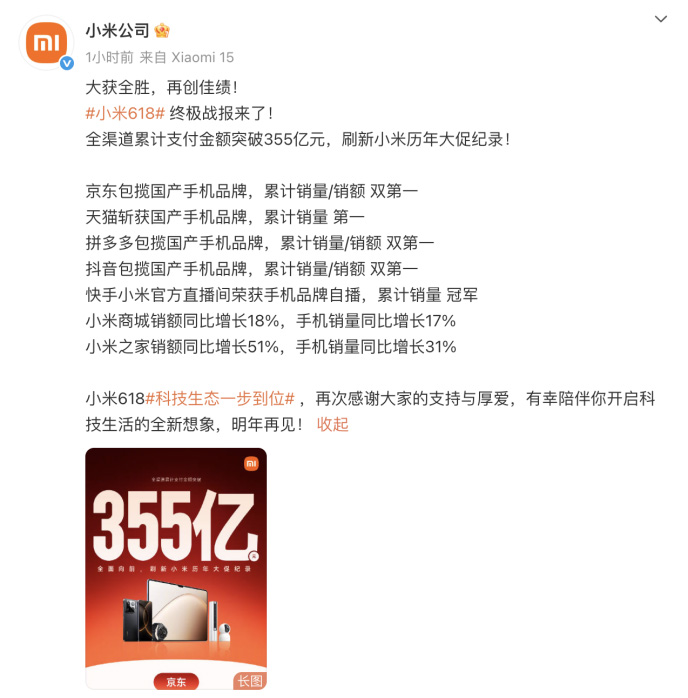 小米618全渠道支付金額突破355億,刷新小米歷年大促紀錄