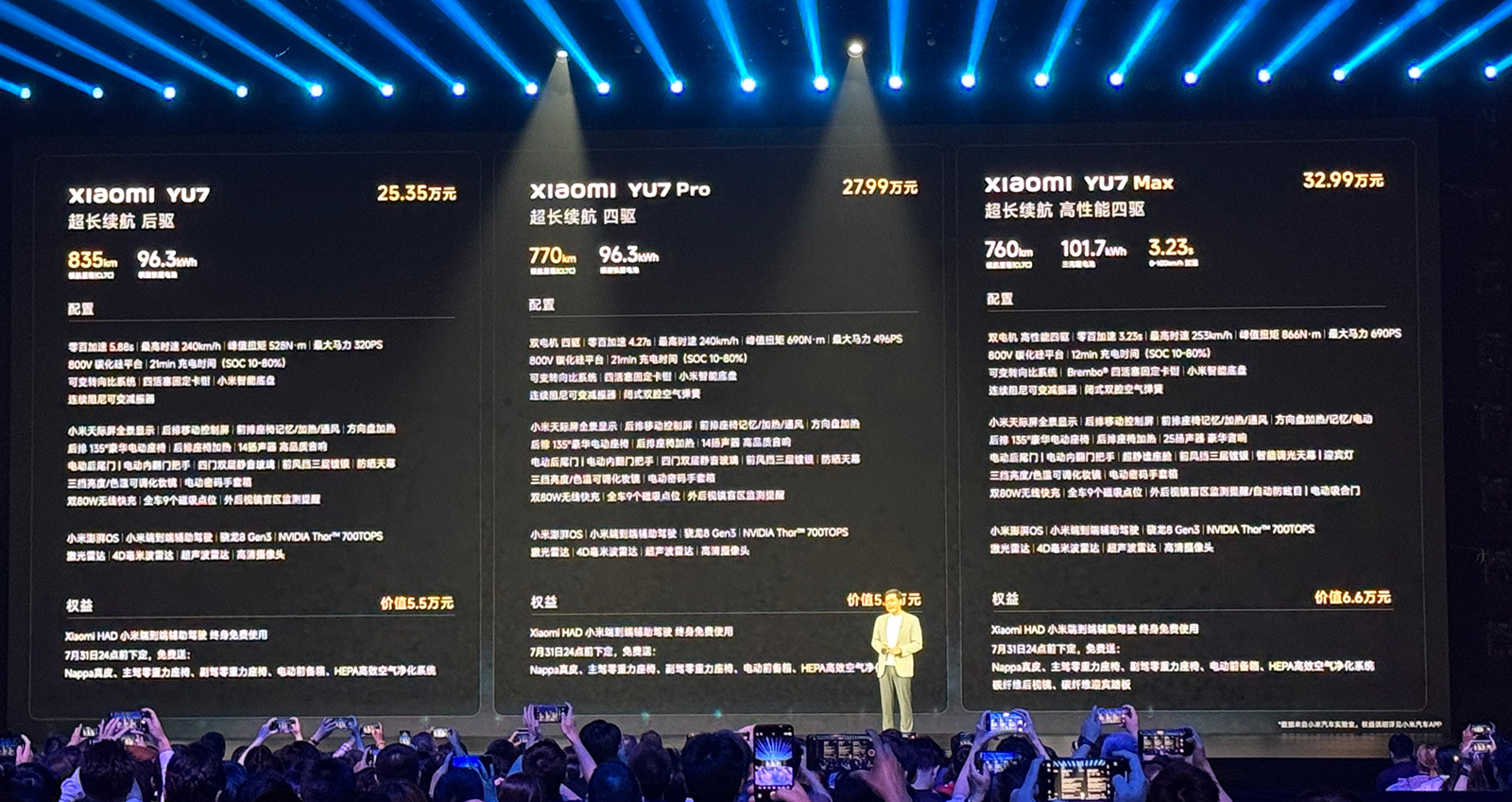 定位豪華高性能SUV的小米YU7,共帶來(lái)三款車型,可選9款車漆顏色、4款內(nèi)飾、6款輪轂、3款輪胎。YU7標(biāo)準(zhǔn)版為25.35萬(wàn)元,835公里續(xù)航,15分鐘補(bǔ)能465公里。YU7 Pro版為雙電機(jī)全輪驅(qū)動(dòng),采用閉式雙腔空氣彈簧,價(jià)格27.99萬(wàn)元,770公里續(xù)航,提供5.5萬(wàn)元首發(fā)權(quán)益。YU7 Max版定價(jià)32.99萬(wàn)元,號(hào)稱擁有百萬(wàn)豪車性能,零百加速3.23秒,配備智能調(diào)光天幕,續(xù)航760公里,提供多項(xiàng)專屬選配(如8款碳纖維部件),6.6萬(wàn)元首發(fā)權(quán)益。
