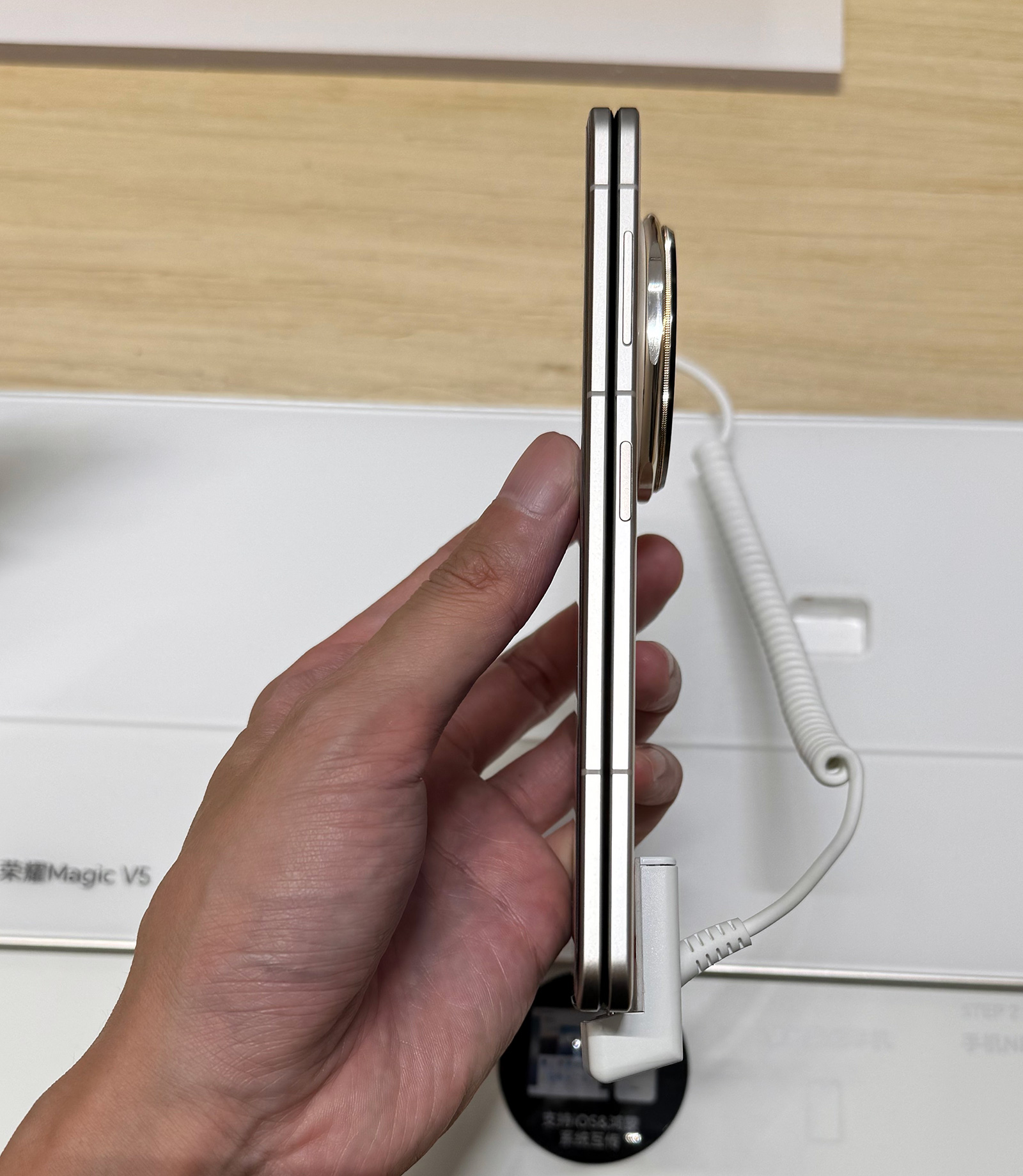 厚度僅有8.8毫米的榮耀Magic V5真機(jī)拿在手上,確實(shí)相當(dāng)薄,重量也很輕,不過鑒于輕薄折疊屏近一年多以來已經(jīng)是行業(yè)共識了,國產(chǎn)各家的大折疊輕薄度講真都比較優(yōu)秀,榮耀Magic V5實(shí)際手感并沒有給我很驚艷的感覺。另一方面,由于機(jī)身做得更薄了,相機(jī)模組的凸起反而更明顯了,尤其是手機(jī)展開之后,相機(jī)凸起比機(jī)身還要厚不少,加上Deco邊緣處理比較雜亂,難免產(chǎn)生突兀感。