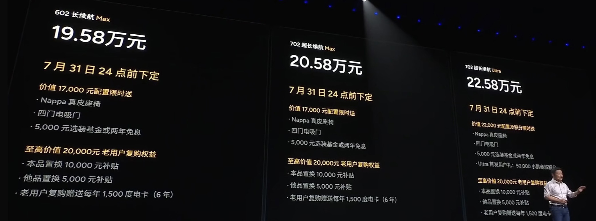 7月3日晚,小鵬汽車舉辦小鵬G7上市發(fā)布會(huì),全面解鎖了這款A(yù)I智能家庭SUV的特性。小鵬G7共帶來(lái)三款車型,G7 Max(602公里續(xù)航)為19.58萬(wàn)、G7 Max(702公里續(xù)航)為20.58萬(wàn)元、G7 Ultra版22.58萬(wàn)元。三款車型的配置差異不大,G7 Max使用2顆Orin-X芯片,G7 Ultra升級(jí)為小鵬自研的圖靈AI芯片。