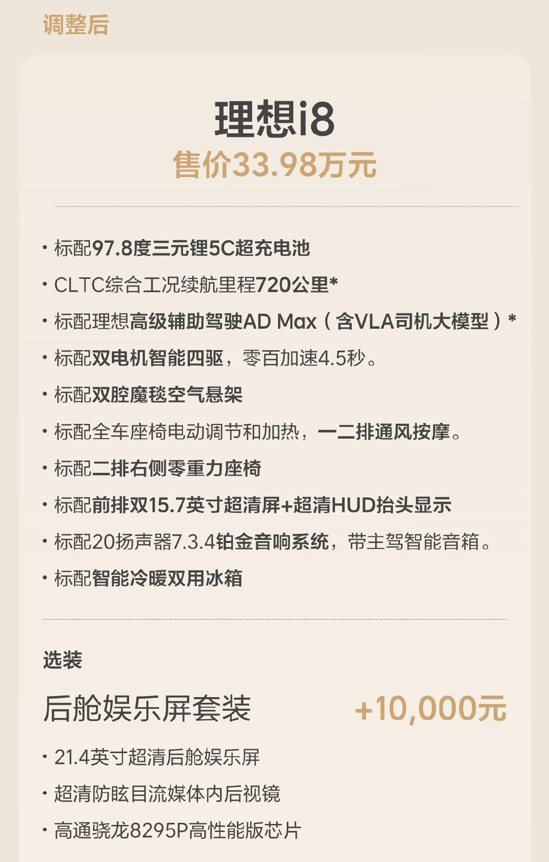 調(diào)整后的理想i8可以視為原i8 Max版的降價(jià)及權(quán)益升級(jí),價(jià)值1萬(wàn)元的后艙娛樂(lè)屏套裝可作為選裝,包含21.4英寸后艙娛樂(lè)屏、防眩目流媒體內(nèi)后視鏡、驍龍8295P芯片三大件,算是彌補(bǔ)了此前i8 Pro和i8 Max的主要槽點(diǎn)。然而此舉的代價(jià)是i8 Pro車(chē)型變相被砍,對(duì)于原計(jì)劃32.18萬(wàn)元入手的消費(fèi)者而言等同于被毀約,理想官方目前提供的解決方案是退訂或升級(jí)兩種選擇,并不涉及毀約賠償,倘若受影響的消費(fèi)者后續(xù)維權(quán),理想汽車(chē)可能會(huì)面臨新的麻煩。